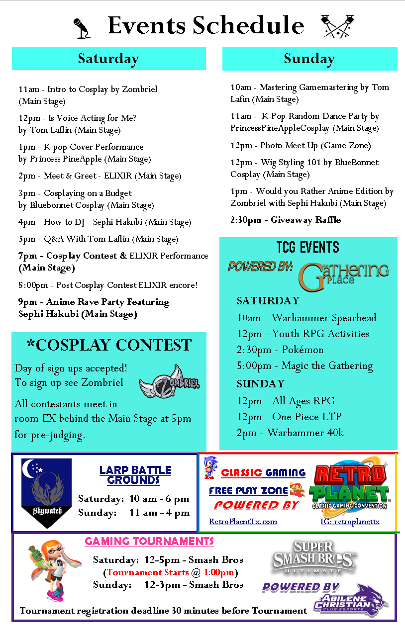 - Explore the Dealers Room & Artist Alley - Experience Retro Gaming - Panels - Trick or Treat Scavenger Hunt - LARP - Photo backdrops - Game Room - Table top gaming - Coloring - Giant Tetris - Relax in THE CHILL ZONE - Meet-n-greet cosplay celebs - Enter the Cosplay Contest - Smash Bros Tournament